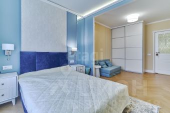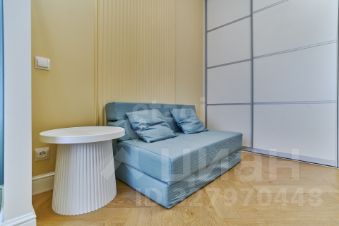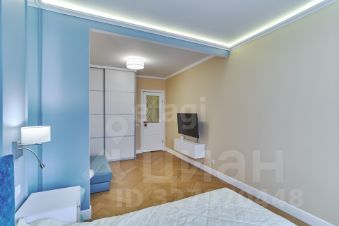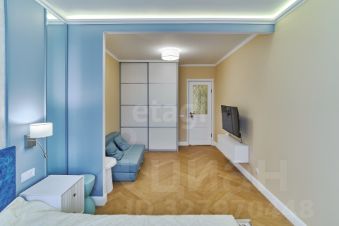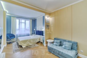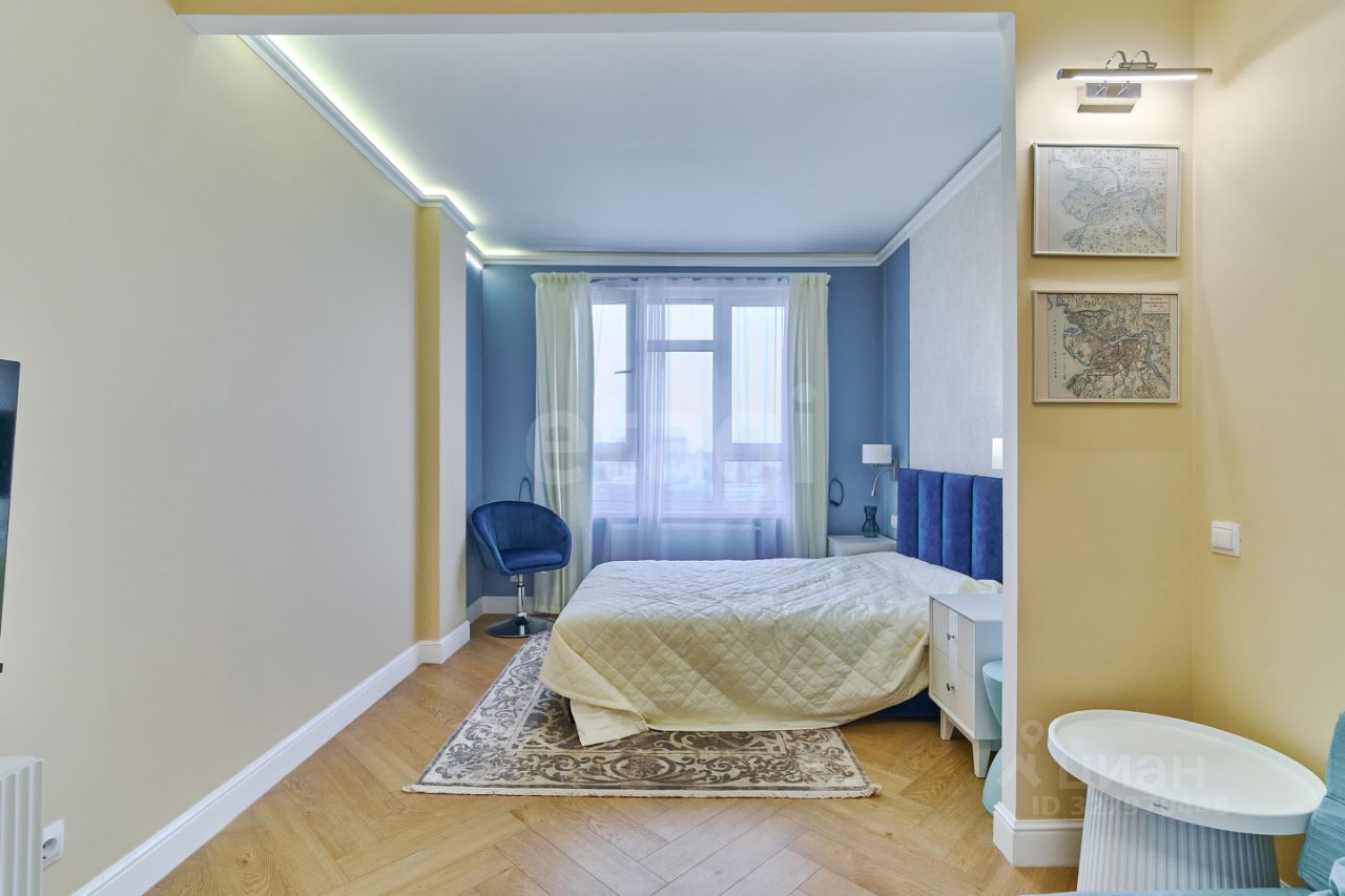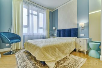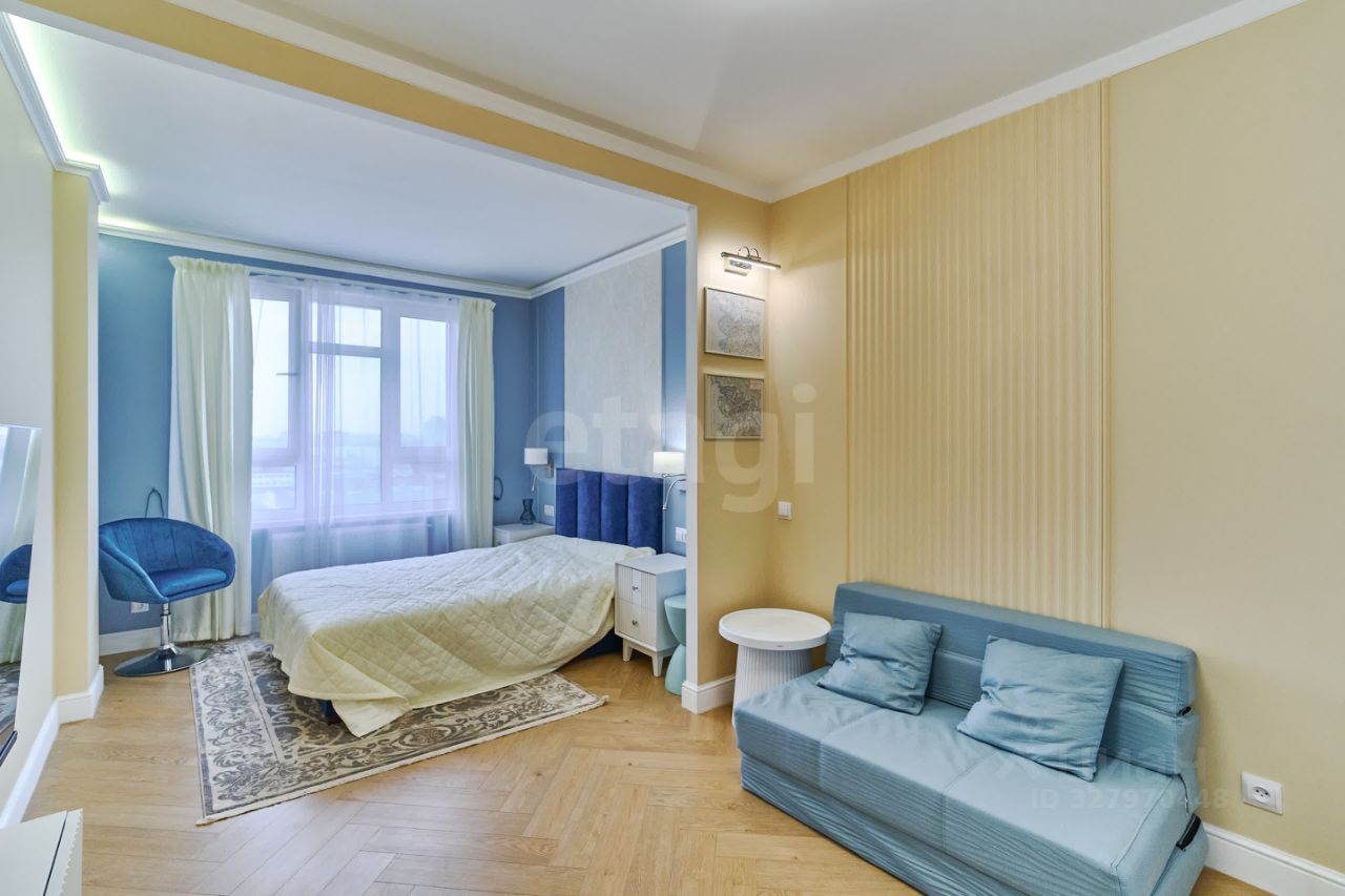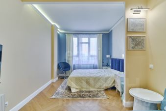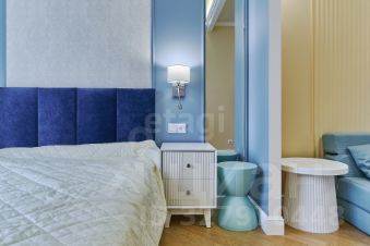 Комната подклеена на спальную зону и уютную гостиную часть. К квартире продуманы разные варианты источников света: контурный по потолку, настенные, локальные светильники, стандартный потолочный.