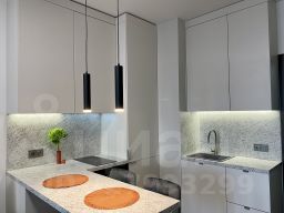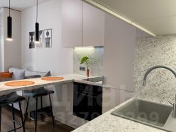 Функциональная кухня со встроенной техникой, включая духовку, цельной столешницей переходящей в обеденную зону и удобным освещением.