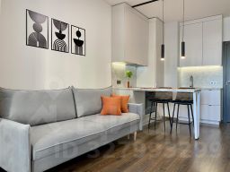 Дизайн выполнен в спокойной гамме с точечными цветовыми акцентами, грамотным зонированием на кухонную рабочую зону и пространство для отдыха с минимизацией визуального шума.