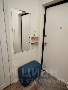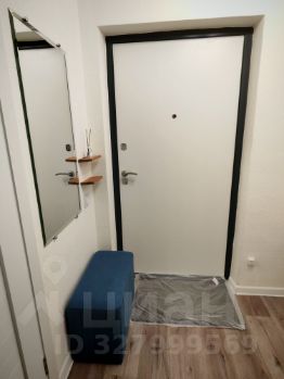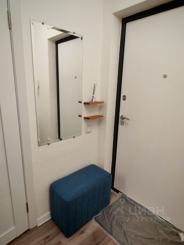 Прихожая: большой шкаф, обувница, пуф, зеркало, коврик, полочки.