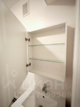 Санузел совмещенный: огромное зеркало-шкафчик (девушки оценят), стиральная машина, шкафчик под раковиной.