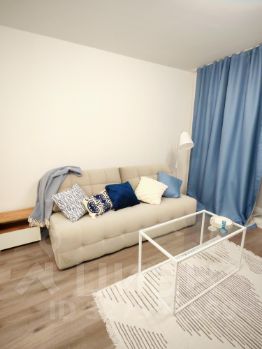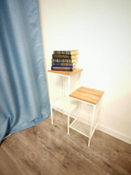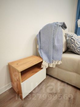Комната: платяной шкаф, прикроватная тумба, качественный диван-кровать (три положения), прикроватный стеклянный столик, торшер, декоративные подушки, плед, аксессуары, книжная полка, ковёр.