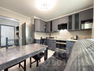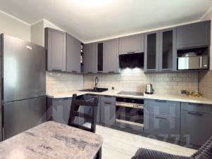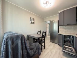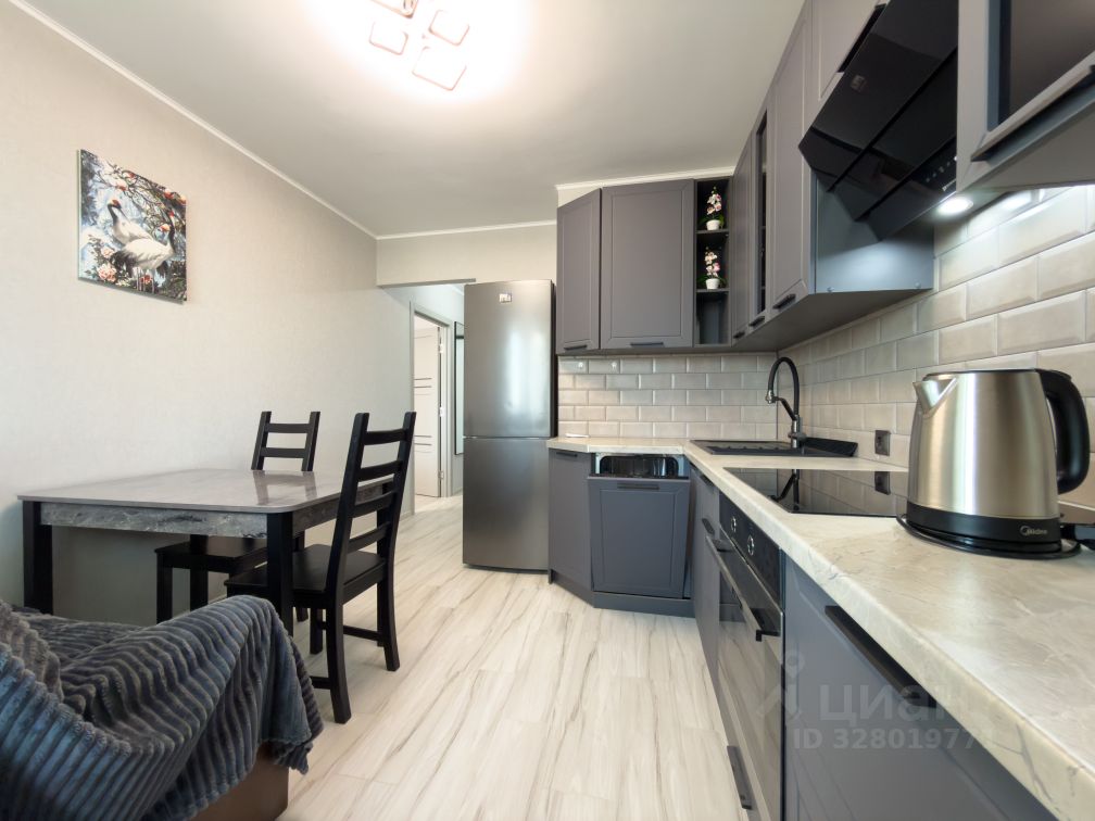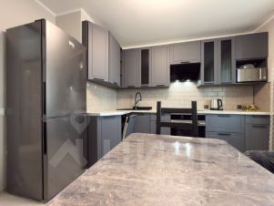 Встроенная кухня с новой бытовой техникой. Холодильник. Посудомоечная машина. Стол, стулья.