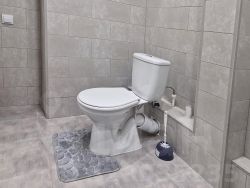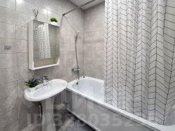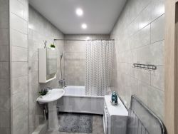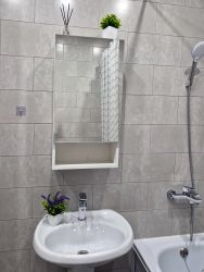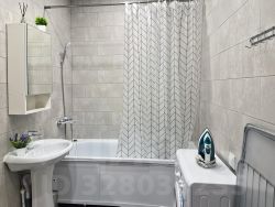 Просторный совмещенный санузел 5.4 кв.м. В санузле - стиральная машина-автомат, полноценная ванна, навесной шкафчик с зеркалом, раковина-стойка. Полная отделка кафелем.