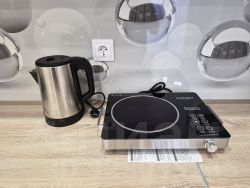 Кухня-ниша 5 кв.м. Кухонный гарнитур с большой квадратной мойкой, двухкамерный холодильник, микроволновка, электрический чайник, электрическая плитка, посуда.