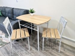 Гостиная-спальня 11.2 кв.м. Столик и два стула с отделкой деревом, огромный раскладной диван, одеяло с подушкой, симпатичный торшер, вместительный платяной шкаф, горизонтальная тумба, утюг, гладильная доска, сушилка для белья.
