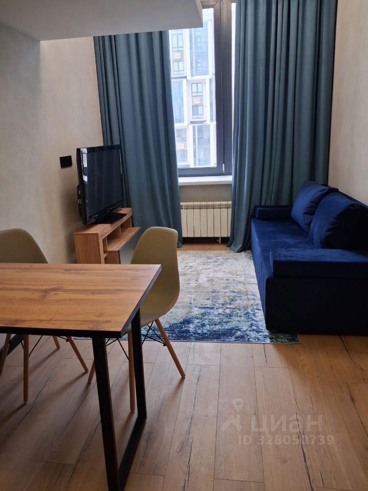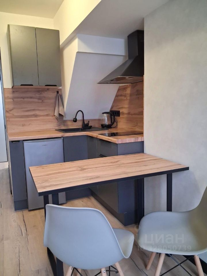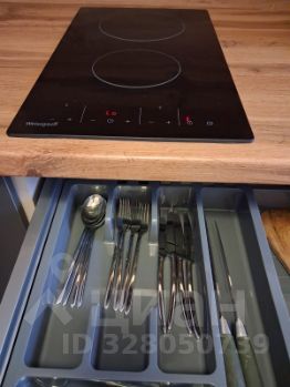 В квартире выполнен дизайнерский ремонт. Функциональная кухня оснащена современной техникой: плита, холодильник,вытяжка, чайник. Также имеется обеденный стол и стулья.