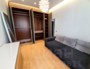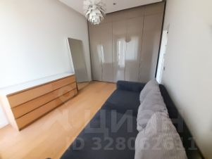 В комнате встроенный шкаф во всю стену, комод, зеркало в пол,
