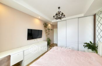 - в спальне: большая двуспальная кровать с прикроватными тумбами, шкаф-купе, комод, телевизор