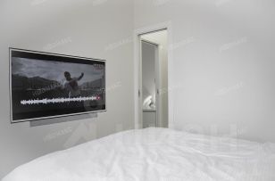 Спальня- размеры минимальны, это место только для сна, телевизор встроен в стену, ящики для постельного белья и аккустическая система класса Hi-end встроены в кровать, жалюзи управляются с беспроводного пульта.