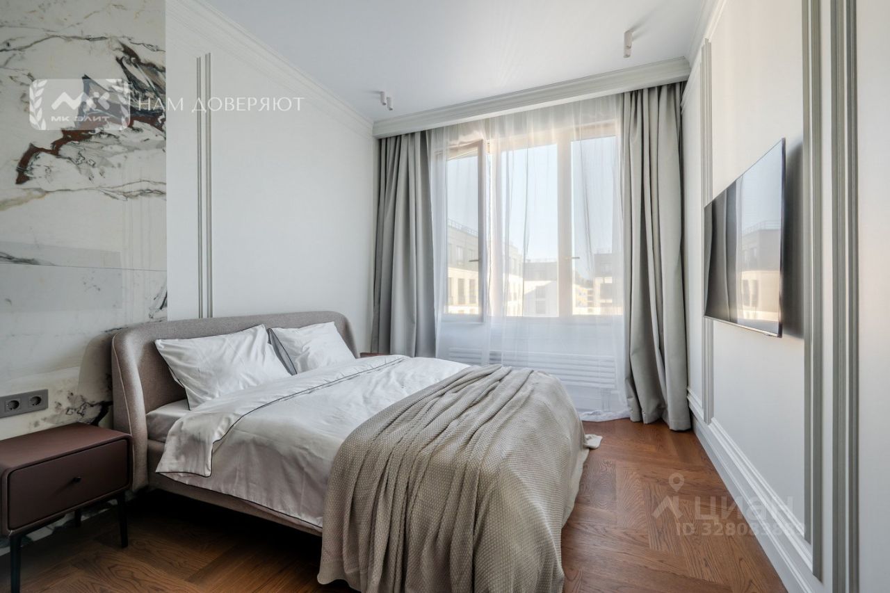 Высокие трехметровые потолки и увеличенные окна обеспечивают обилие света и простор. Планировка квартиры включает уютную спальню, стильную просторную кухню-гостиную, ванную комнату и гардеробную.