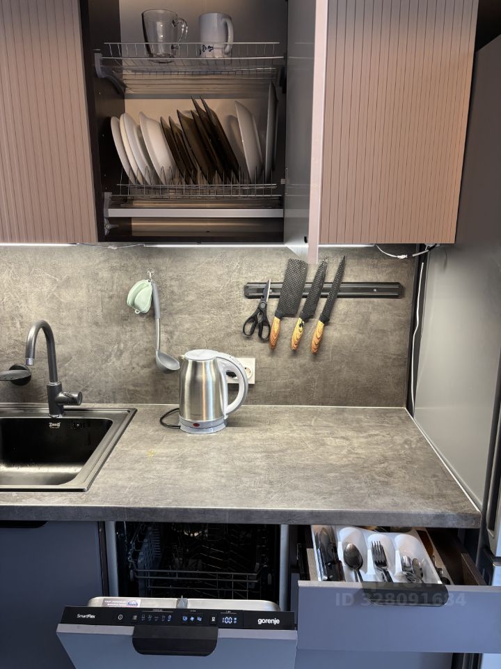 На кухне есть вся необходимая техника: •посудомоечная машина, вытяжка, плита, духовой шкаф, микроволновая печь
