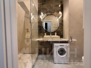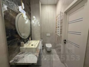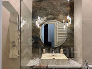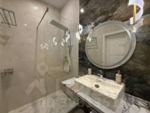Санузел совмещённый, выполнен в стильном мраморном оформлении.