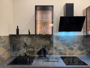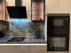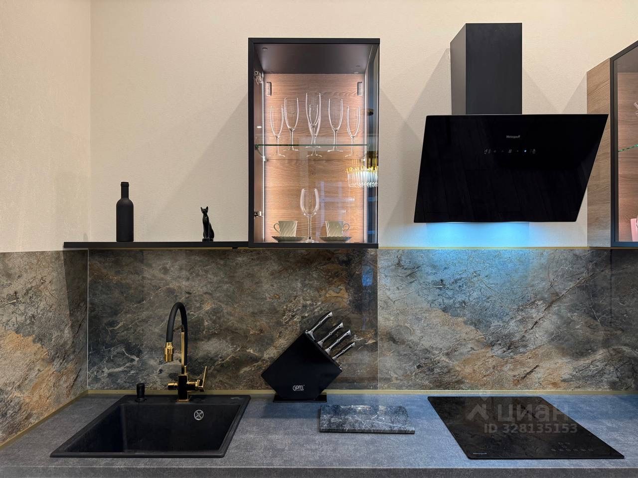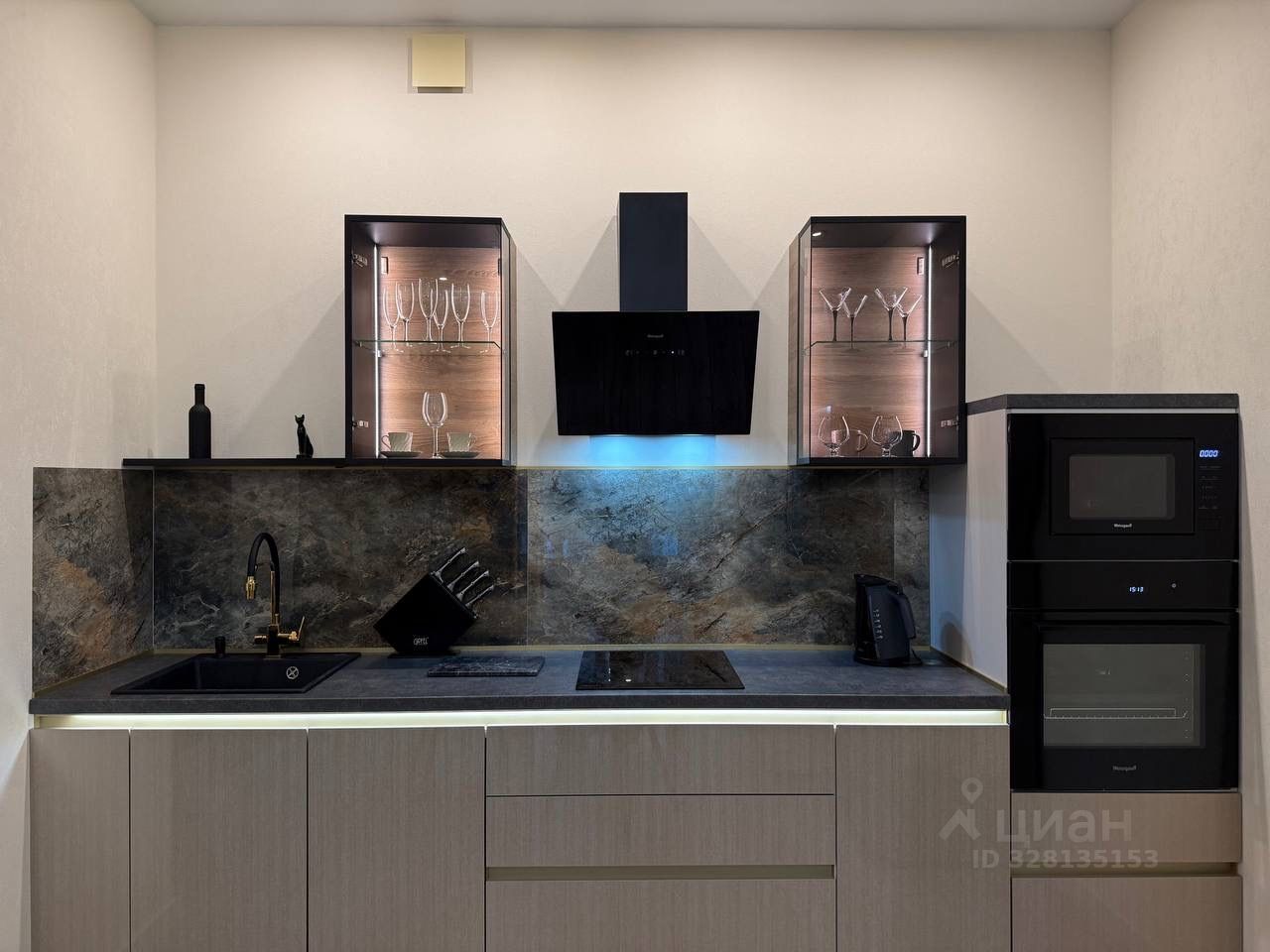 Просторная кухня оснащена современной техникой, включая холодильник и духовой шкаф. Из мебели — вместительные шкафы и удобный диван. Телевизор.