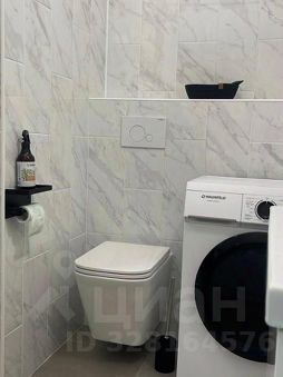 Ванная комната: установлена инсталляция, стиральная машина с фронтальной загрузкой до 7 кг., класс энергосбережения A+++, ванна, раковина и шкаф с зеркалом.
