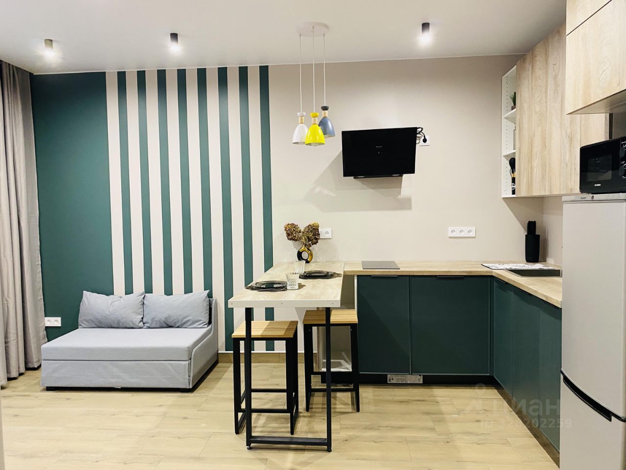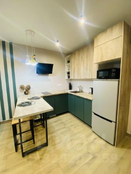 Внутри квартиры есть всё необходимое для комфортной жизни: мебель на кухне и в комнате, современная техника, включая холодильник, посудомоечную и стиральную машины, а также телевизор. Санузел совмещённый и оборудован ванной. Окна выходят во двор, поэтому всегда тихо и спокойно.