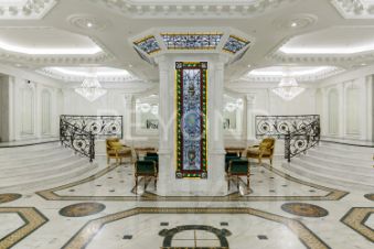 Клубный дом "Фонтанка, 76" - элегантный архитектурный стиль, фасад из натурального камня, парадный вход, торжественная декоративная подсветка, интерьеры входной группы и холлов - проект Roberto Molon.