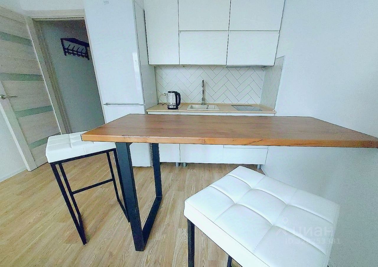 Мебель: Двуспальная кровать (приобретение матраса обсуждаемо), распашной шкаф, барный стол, 2 барных табурета, кухонный гарнитур, шкаф с зеркалом в полный рост, вешалка с полкой, шкафчик с зеркалом в ванной
