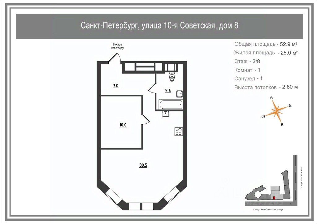 — общая площадь 52,9 м², третий этаж из восьми;