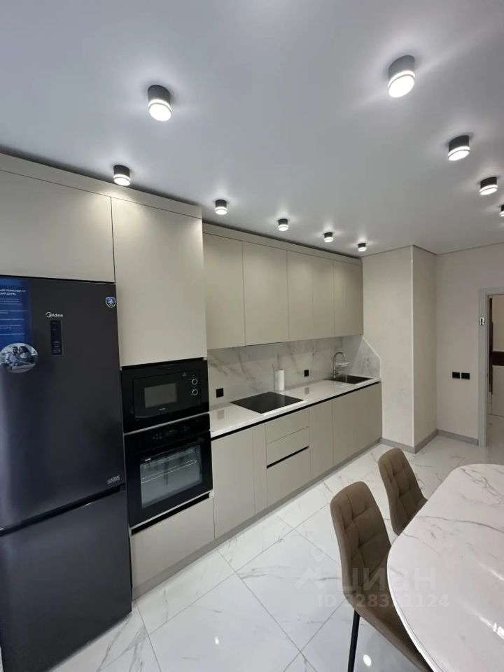 Кухня 15 кв.м. оснащена современной мебелью со встроенной техникой (варочная панель, духовой шкаф, микроволновая печь, вытяжка, посудомоечная машина, холодильник, чайник, установлены фильтры на воду). Из кухни есть выход на балкон.