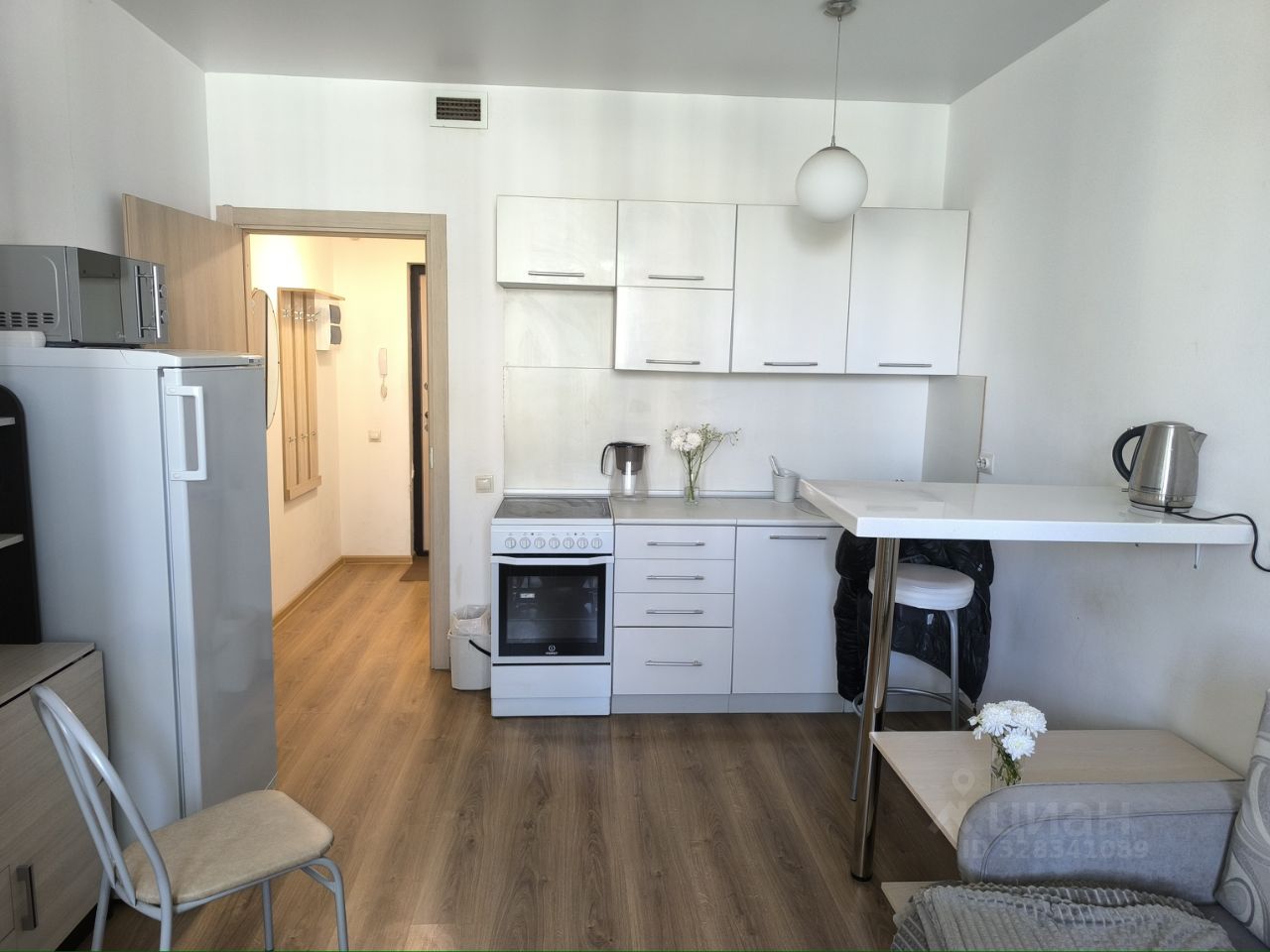 Кухня оборудована холодильником, плитой и микроволновой печью. Санузел совмещенный, оснащён стиральной машиной и ванной.