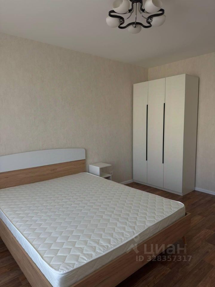 В квартире сделан косметический ремонт: поклеены обои и новая мебель в спальне.