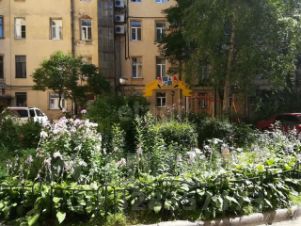 Красивый зелёный двор. Рядом магазины, кафе, фитнес клубы и салоны красоты.