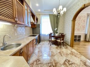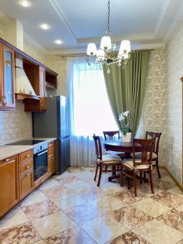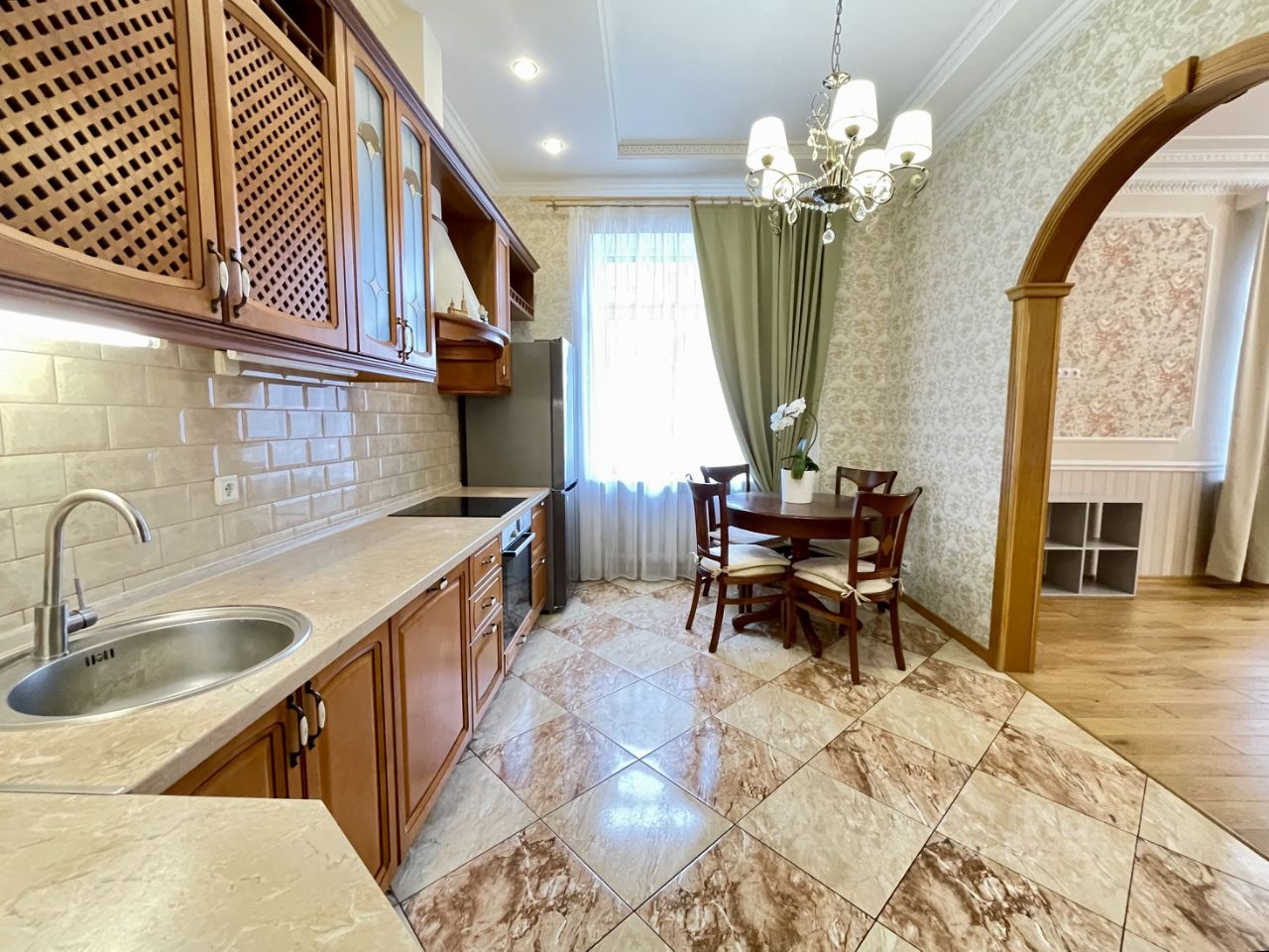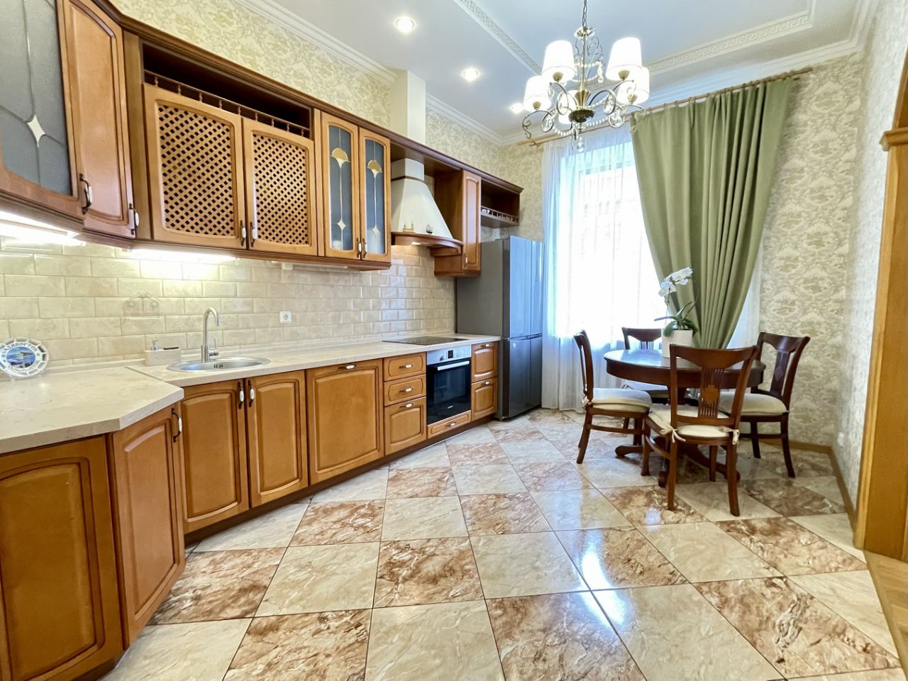 Уютная и просторная кухня в классическом стиле - 14,5 кв.м. оснащена всей необходимой бытовой техникой, включая варочную панель, духовой шкаф, посудомоечную машину, вытяжку, холодильник Side-by-Side.