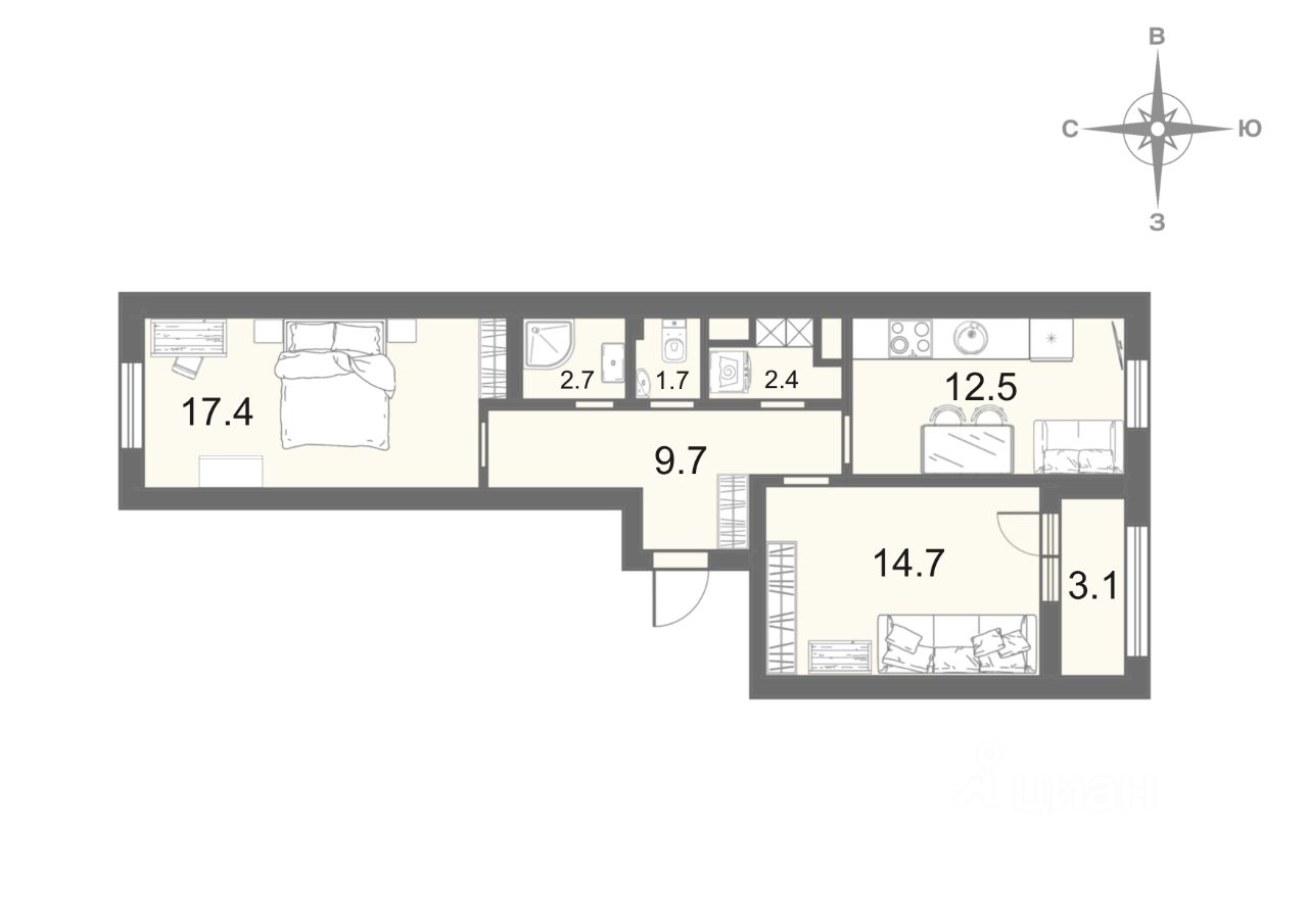 — Просторная планировка: большие комнаты + места для хранения и гардеробная.