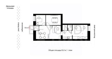 Помещение расположено на 1 этаже и имеет функциональную планировку, включающую рабочие кабинеты, зону для переговоров, а также вспомогательные помещения. Окна ориентированы как на набережную, так и во внутренний двор, создавая баланс между открытостью и камерностью пространства.