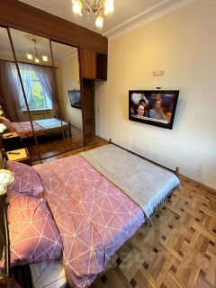 - Спальная оборудована, двуспальной кроватью, зеркальный шкаф купе, прикроватные тумбочки, ТВ.