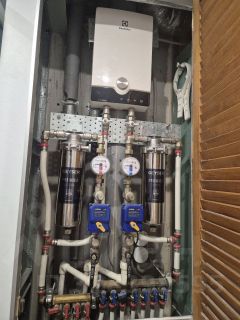 Современная европейская сантехника, установлены проточные фильтры для воды и проточный водонагреватель, система защиты от протечек Нептун.