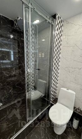 Сан узел сделан в современном стиле с просторной душевой и тропическим душем .