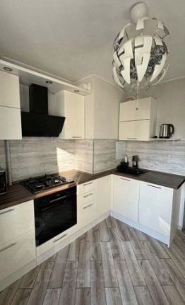 Квартира оснащена полноценной кухней с современной встроенной техникой (Хододильник , духовой шкаф , микроволновая печь , плита ,вытяжка ,чайник ,стиральная машина).