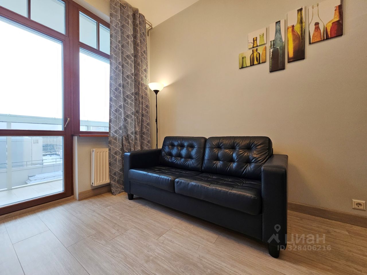 В гостиной зоне раскладной диван из натуральной кожи, ЖК телевизор, торшер.