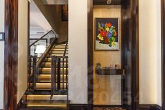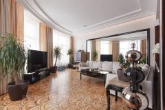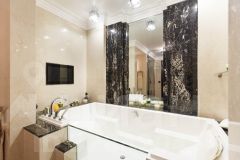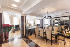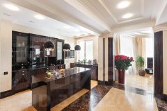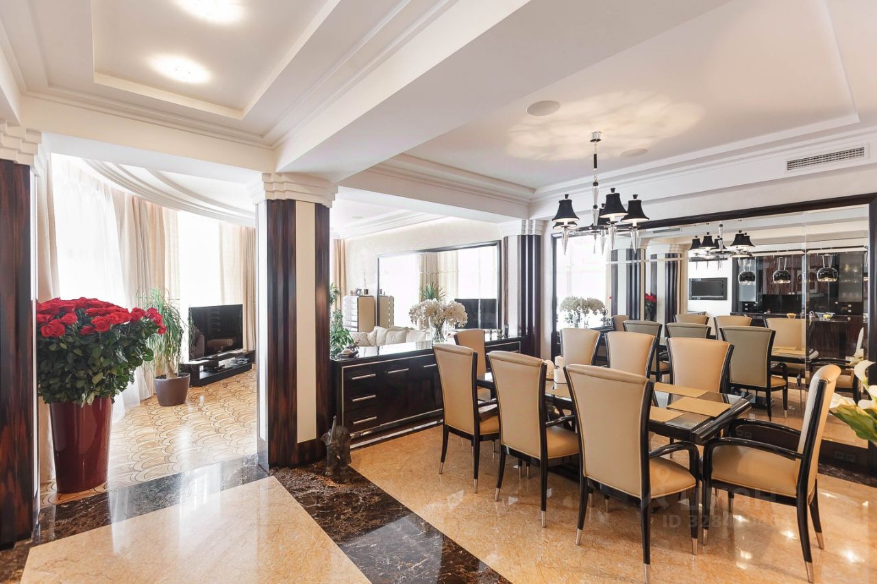 Дом относится к элитной категории жилья, соответствует всем критериям и качеству надежности и комфорта, сдан под заселение в конце 2006 года. Снаружи выполнена отделка фасадов натуральным камнем. Площадь предлагаемой в аренду квартиры 240 кв.м, расположена на 8/8 этажного дома.