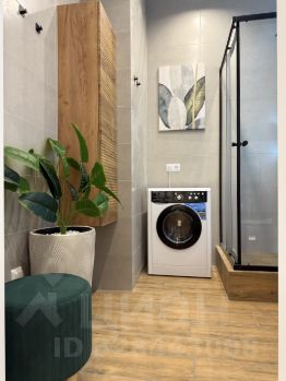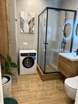 - Совмещённый санузел: душевая кабина, стиральная машина, инсталляция, шкаф для хранения.