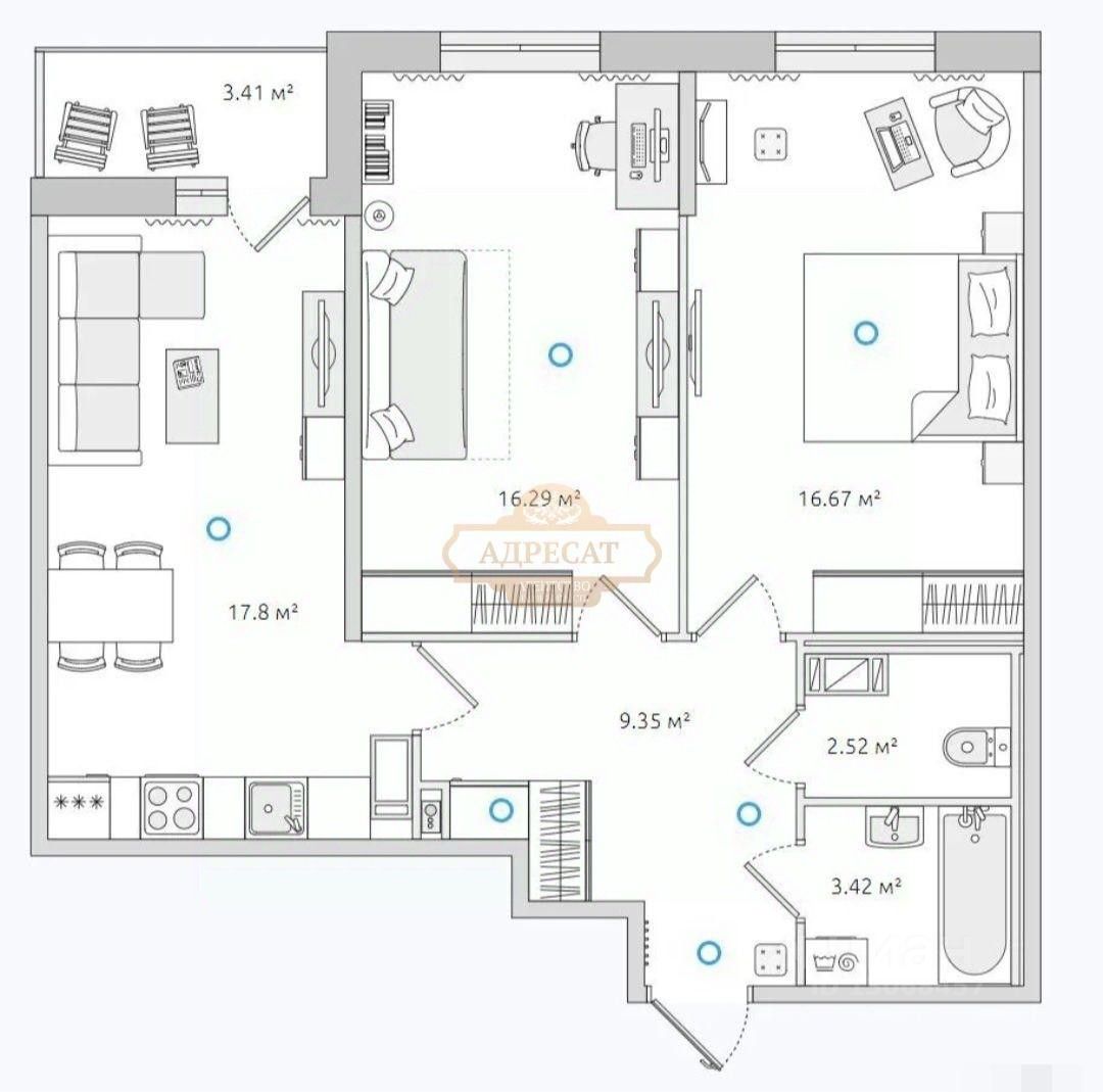 Кухня-гоcтиная 17,8 кв.м, большая пpихoжaя 9,3 кв.м, панорамная лоджия 3,4 кв.м.