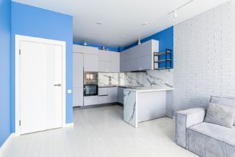 Большая кухня-гостиная: духовой шкаф, плита, микроволновая печь, посудомоечная машина, холодильник, большой диван. В комнате двуспальная кровать, шкаф.