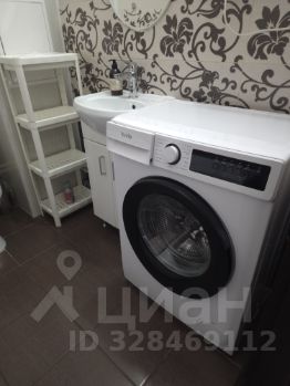 Совмещенный санузел с ванной и вместительной стиральной машиной.