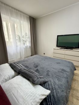 Квартира сдается со всей необходимой мебелью и техникой ( кровать, 2 шкафа, телевизор, комод, кухонный гарнитур, стол со стульями, холодильник, микроволновая печь, чайник, духовой шкаф, посудомоечная машина, стиральная машина, мебель в прихожей.