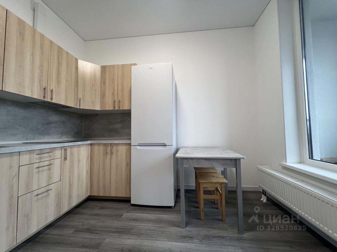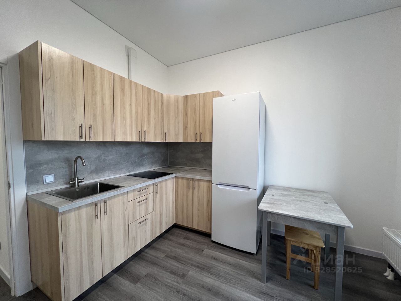 В квартире есть необходимая техника и мебель: кухонный гарнитур, варочная поверхность, вытяжка, холодильник, кухонный стол, стулья, стиральная машинка, двуспальная кровать, шкаф в коридоре.
