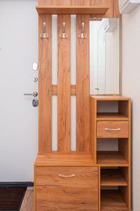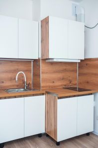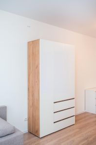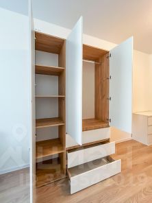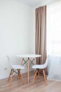 Квартира полностью укомплектована всем необходимым для комфортного проживания. Интерьер выполнен в светлых тонах с элементами дерева, что создает уютную атмосферу.