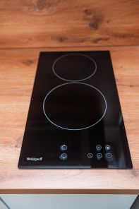 Кухонная зона: современный гарнитур, индукционная варочная панель, холодильник, микроволновая печь, электрочайник.