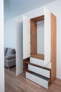 Жилая зона: удобный раскладной диван, вместительный шкаф для одежды, комод, обеденный стол со стульями.