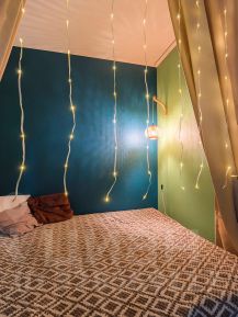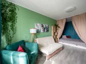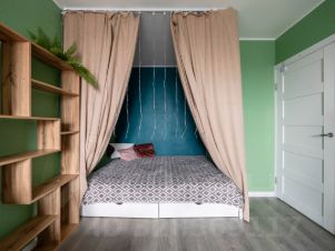 Подходит для тех, кому надоели белые и серые стены. Внутри очень уютно6 как будто свой мир. Максимально функционально использовано пространство. Спальное место отделено и укрыто шторами. Внутри лофт светильник для чтения книг и планируется под них пару полок . Таким образом появляется отдельная гостиная, где комфортно проводить время. Шкаф с внутренней подвеской , чтобы вам было комфортно выбирать, что надеть. Таршер около и кресла и дивана , чтобы удобно было отдыхать за вашим любимым хобби и отдельная рабочая зона.