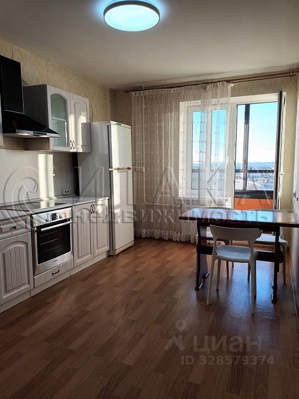 На кухне- кухонный гарнитур с керамической варочной поверхностью и духовым шкафом, также есть электрическая вытяжка, двухкамерный холодильник, электрический чайник, стол, стулья, выход на застекленный балкон 3 кв.м.