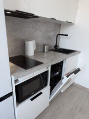 • В квартире два спальных места: кровать и раскладной диван. Достаточно мест для хранения вещей, полноценная ванная, кухня с электроплитой, микроволновкой, холодильником. В ванной: стиральная машина.