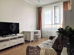 В комнате - большой телевизор. Высокий шкаф с полками и штангой для одежды вместит всё необходимое. Комфортная планировка: просторная зона прихожей, комната и кухня отделены дверями с хорошей шумоизоляцией, широкая лоджия.