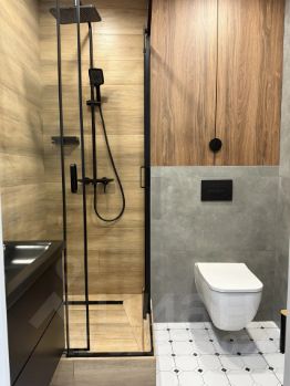 Санузел совмещен, оборудован душевой кабиной. Отдельно оборудована постирочная, которая может использоваться как дополнительное место хранения.